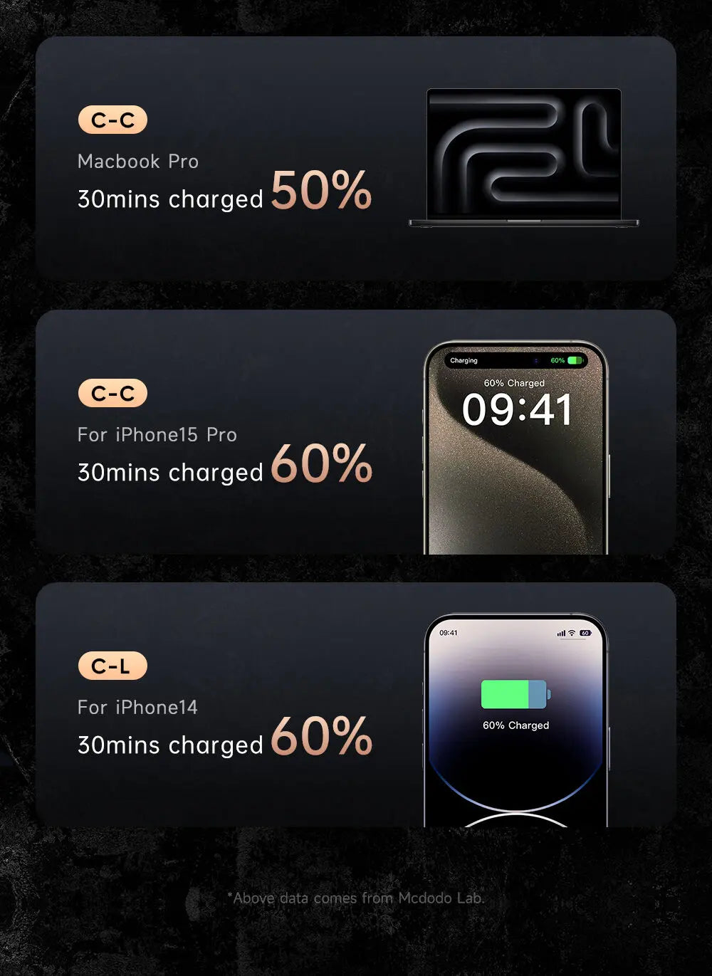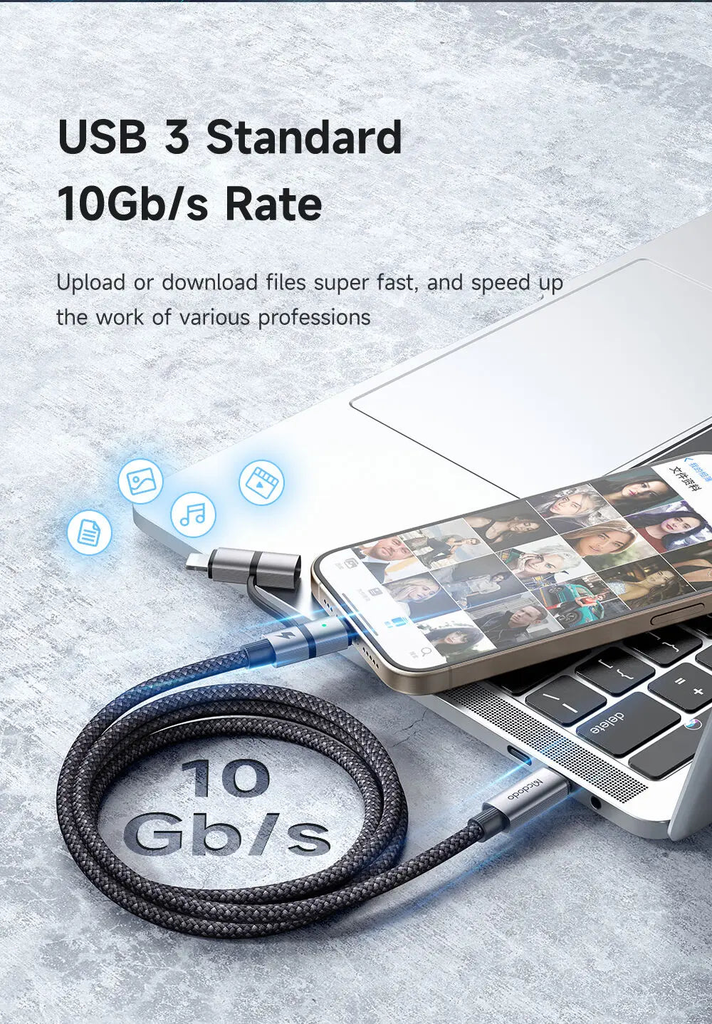 - The cable supports data transfer speeds of up to 10Gbps and up to 100W (20V/5A) of power, and comes with USB-C to USB-C / Lightning connectors on both ends at a cable length of 1.2 meters.